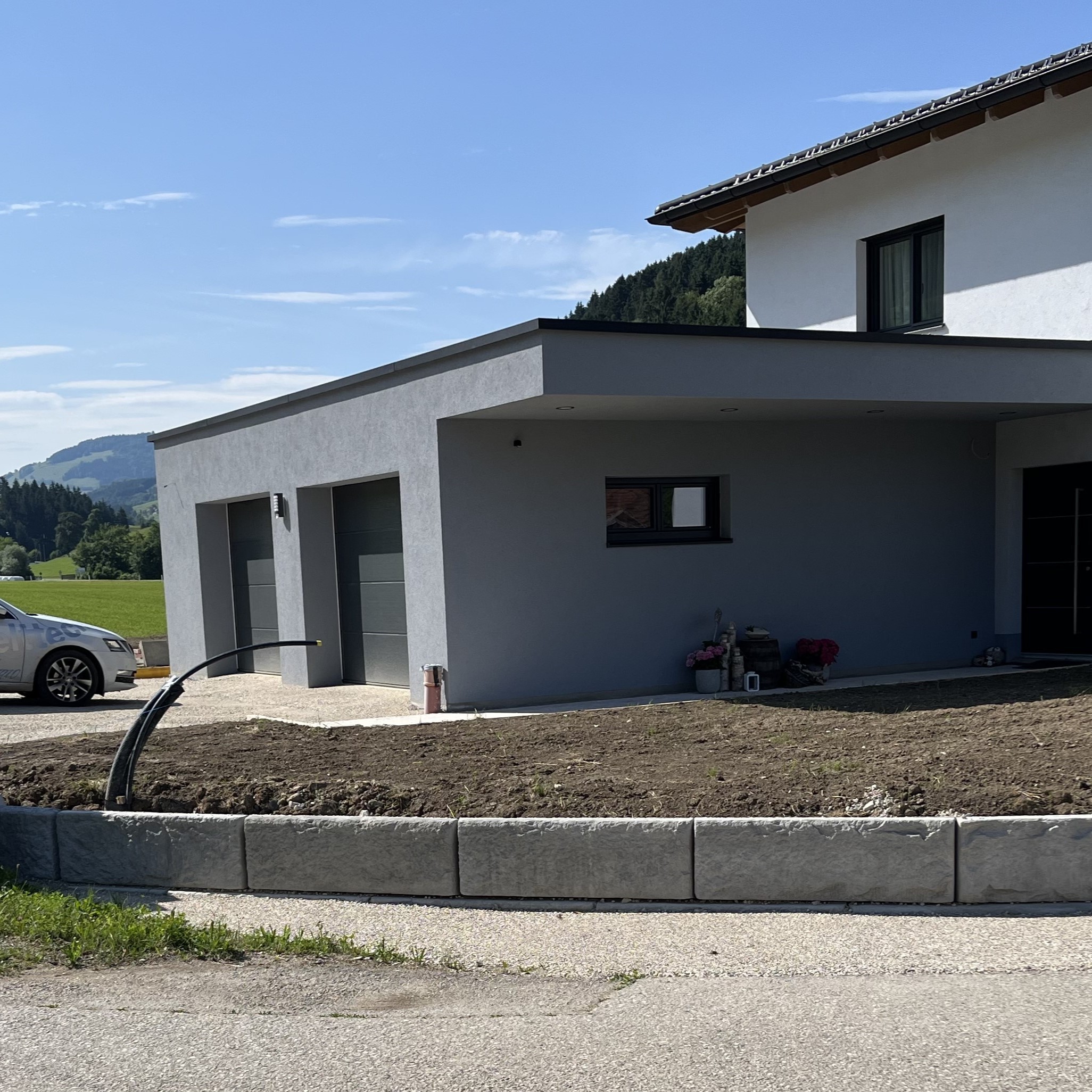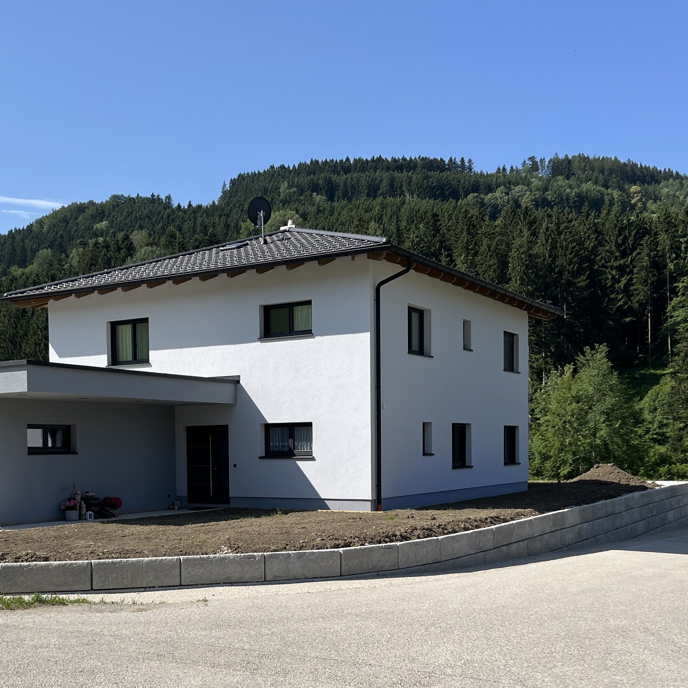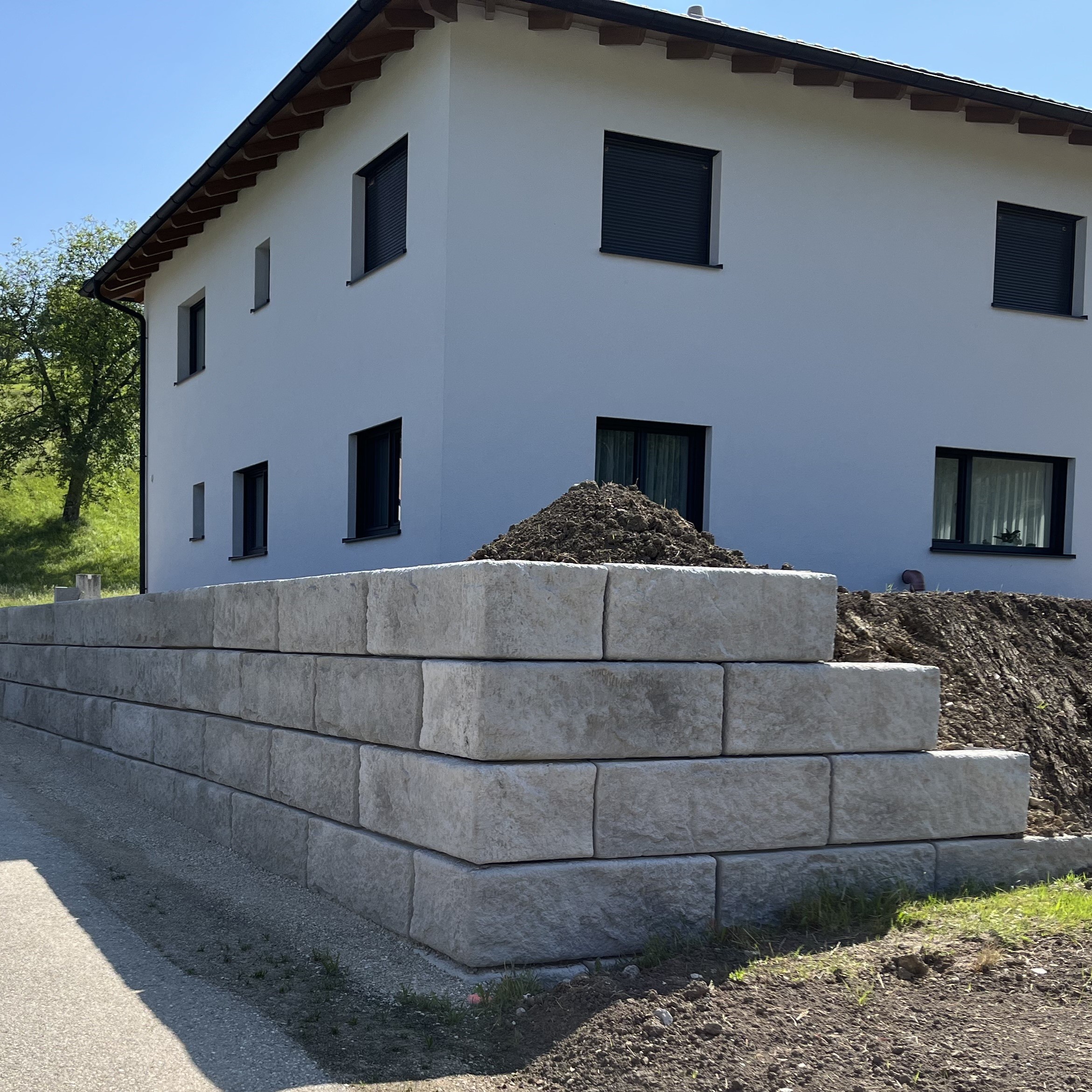 Bei einem Privathaus in Ertl wurde eine Grundstückseinfriedung errichtet. Aufgrund der schnellen Bauzeit und optischen Formgebung wurde das SW-Stützwandsystem gewählt. Die mögliche Erweiterung der Stützwand war ebenfalls ein Aspekt und wurde auch bereits umgesetzt.